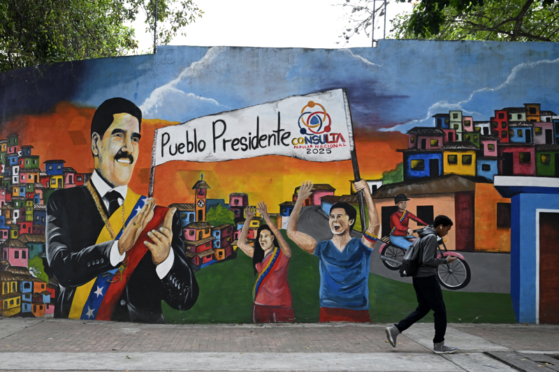 在委内瑞拉齐门加拉加斯,行东谈主从缓助委内瑞拉总统马杜罗的涂鸦墙前走过。新华社发